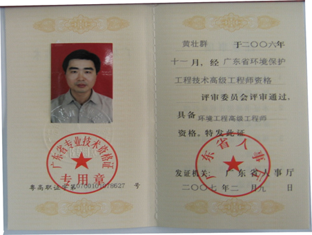 黄壮群:高级工程师,现在广东环境保护工程职业学院环境监测系任教,校外职务,为我司环保工程技术顾问,长期从事水污染控制技术、固体废物的处理及处置和综合利用、水处理剂和水体监测、物理污染监测方面的科研工作。先后完成了省部级科研项目二项;省厅级教改教研项目一项;院地级教改教研项目一项;在工程方面先后完成了50多项环境治理工程项目,其中有2个工程项目被评为广州市优良样板工程;公开发表论文12篇,其中:核心期刊发表论文4篇,省级刊发表论文3篇。现为广东省、佛山市、清远市等地环保专家库专家。